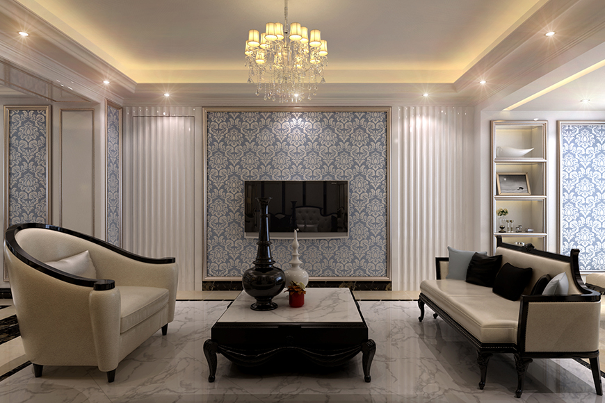 客厅电视背景以高亮度油漆面板做装饰,配以蓝色刺绣墙布,衬托出年轻、时尚、低调奢华的感觉,电视背景以软包做为装饰,温馨舒适。